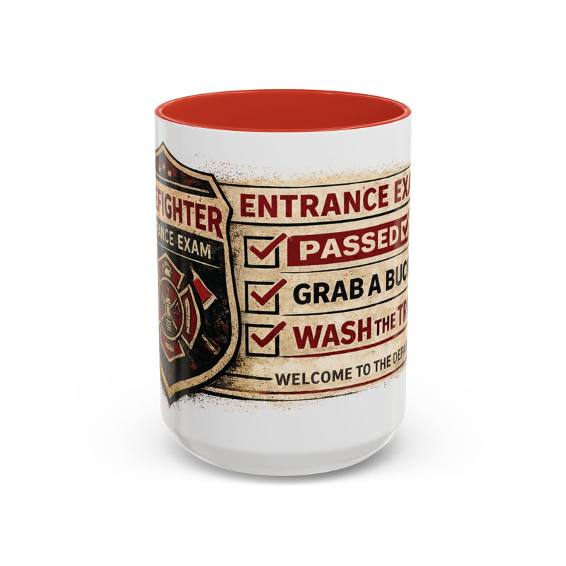 Firefighter Coffee Mug – Funny Fire Department Gift | “Entrance Exam: Passed, Grab a Bucket, Wash the Truck”